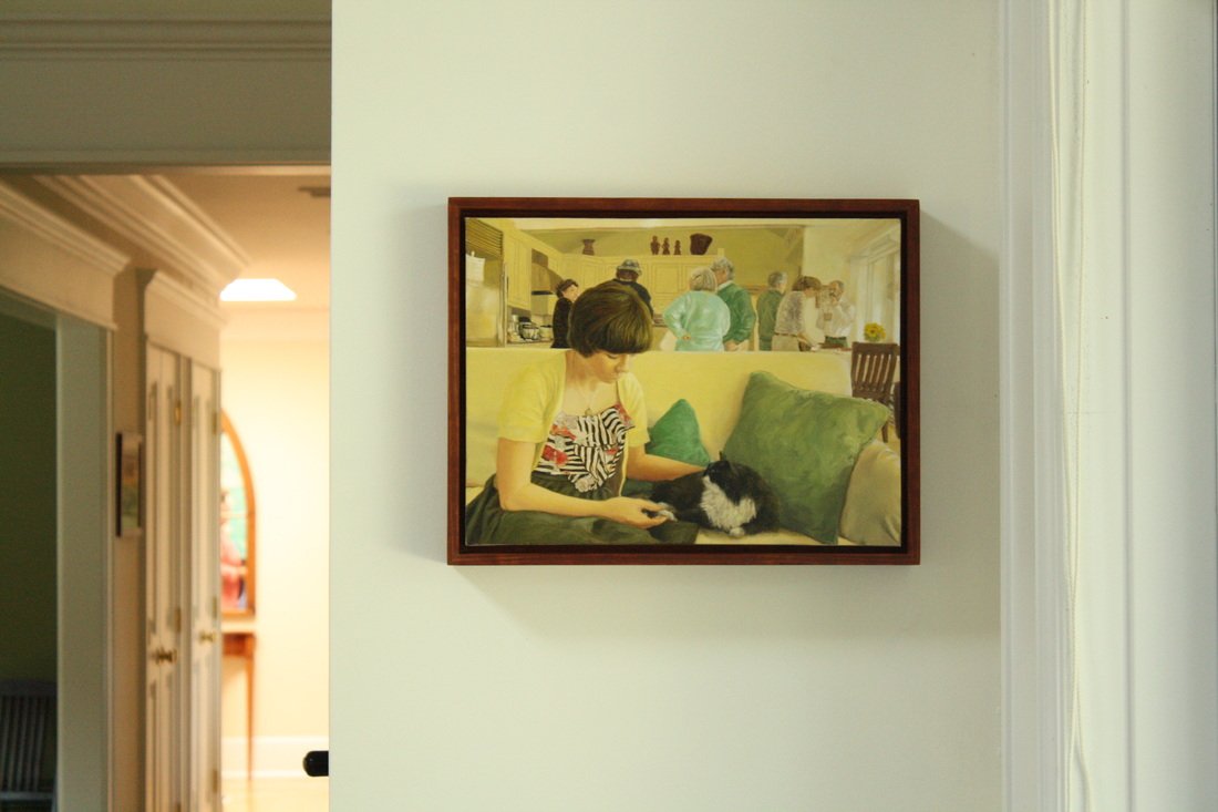 On the Fourth of July, we visited Nate's extended family and got to see my self portrait from a couple years ago, framed and displayed in their kitchen. Nate's uncle did an impeccable job with the framing. I was just thinking about floating frames as I was falling asleep the night before actually. It's amusing that they chose to hang it in the space that it depicts. So while the wood frame matches the chairs and terra cotta in the painting, it complements the actual chairs and terra cotta in the room. It was also amusing that the same company was present this weekend as seen in the painting. Including Whiskers. Sometimes it's hard for me to remember that I didn't actually hold Whiskers' paw. I'm a little skittish when it comes to cats (even Whiskers, who typically has a friendly puppy dog temperament) but it's nice to imagine myself slightly detached from the group, connecting gingerly with a cat and letting go of any apprehensions. However, after attempting to scratch Whiskers' belly this weekend, I would prefer to steer clear of any paw holding!