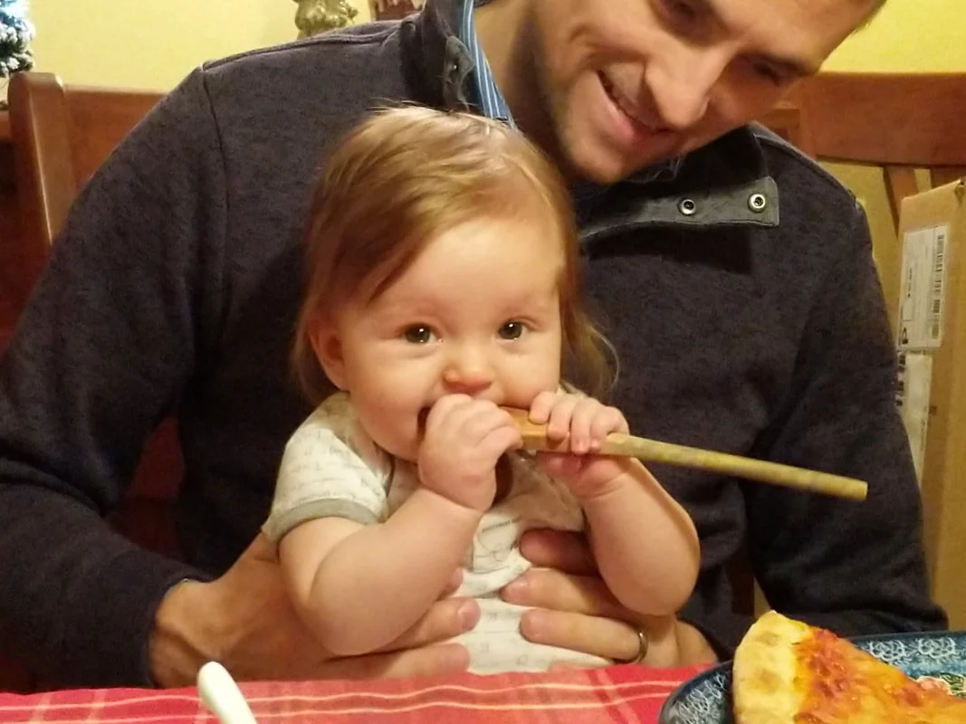 I arrived last Friday afternoon after a rainy, misty drive, and Juliette arrived with my brother and sister-in-law the following evening. JJ had some dinner, took some time to bang a wooden spoon on the table (provided by grandma), and then prepared for her nightly routine. This included a bath in the kitchen sink, pajamas and a fresh diaper, and bed. They have this big suit they put her in that makes her look like a marshmallow, but it prevents her from rolling in her sleep so she stays on her back.