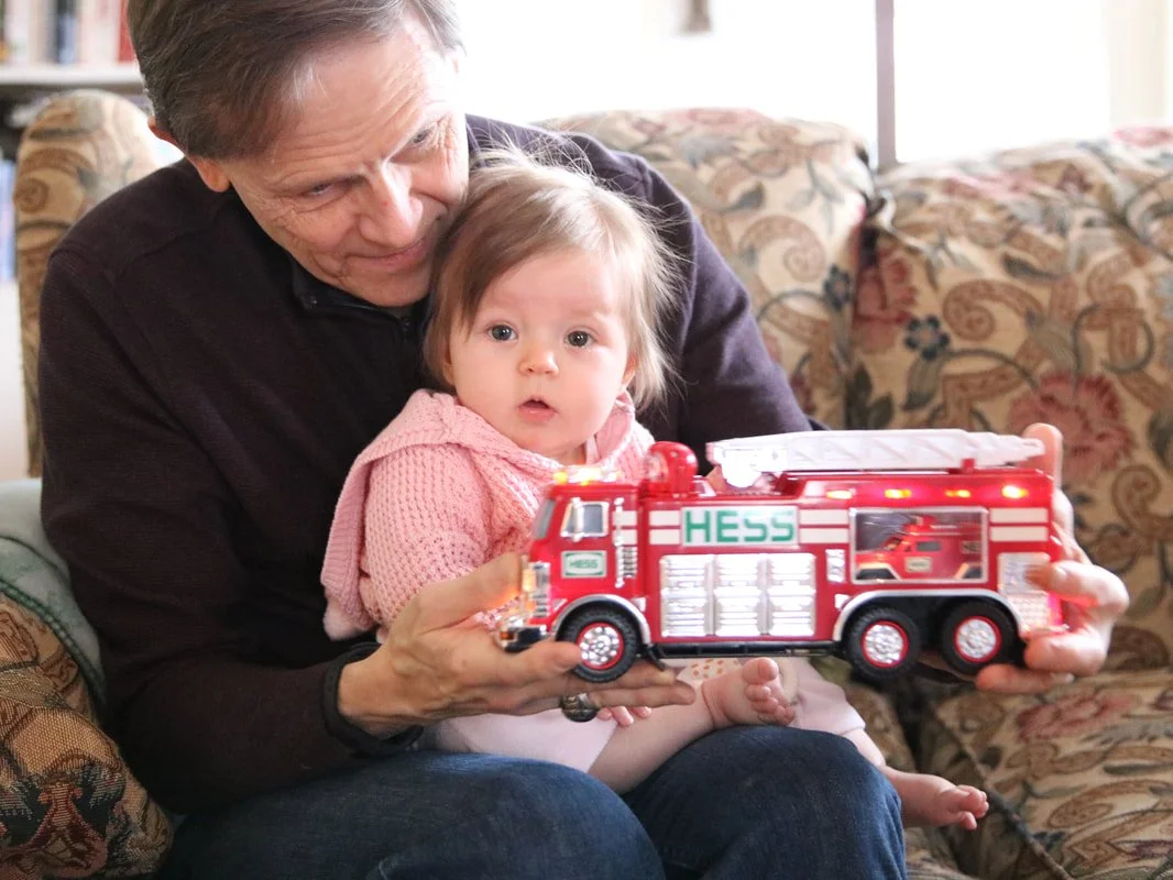 On Christmas Eve, mom handled the cooking, and Juliette was passed around from lap to lap. My parents call this a "pass-around pack". We did a couple of small photo shoots, including one with the guinea pigs to compare to a similar pose of my brother with my parents' guinea pigs Jemima and Manfred. We took another of Juliette in my dad's old cap from when he was a baby, and another with a HESS truck (my brother was fond of those as a kid).