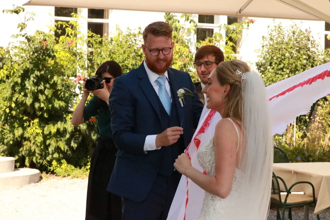 That said, it was such a fun wedding! The ceremony took place under a long line of linden trees in the front lawn, looking over the valley. I tried to covertly take some photos while also staying out of the way of the actual photographers and not ruining any photos with my camera being out. They did a nice job of pairing English and German, and the ceremony was completed with the bride and groom signing their names on a marriage certificate, as well as the Maid of Honor and Best Man. After they walked back down the aisle, they took part in an Austrian tradition of cutting a heart shape out of a large sheet, each racing to cut out their half. Lukas won, but Katie was a good sport.