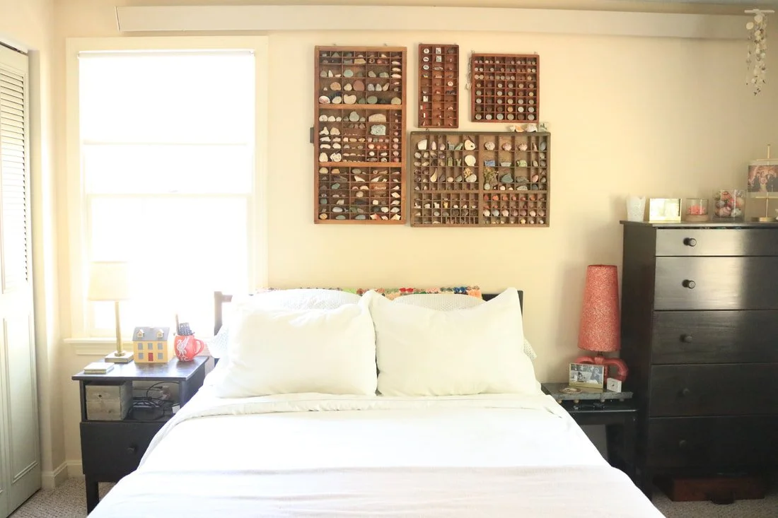 My various collections above the bed were such a pain to pack up and then rehang but I like the type trays clustered together in this way, rather than scattered throughout the space. I ended up numbering each item so I could just match them with the appropriate compartment rather than try to find a good spot for everything all over again. So far no rocks or coins have fallen on our heads. They were fine in the busy living room at our last place - I think only a seashell or two came loose over the course of 6 years - so I think we should be fine. (Knock on wood.... just not on the wooden type trays.)